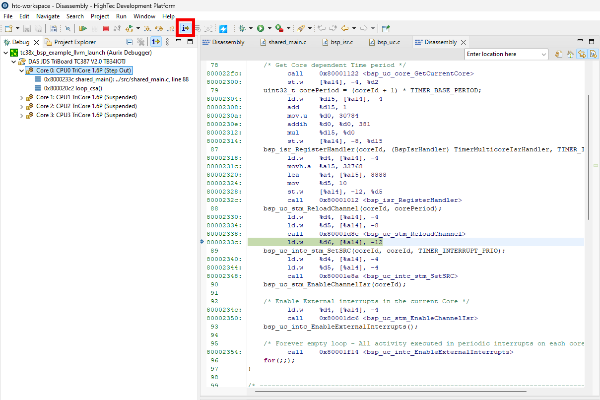 The debugger is also able to switch between stepping modes. Not only source level stepping is supported, but assembly level stepping as well. This stepping mode can be switched with the Instruction Stepping Mode button.